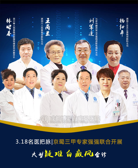 为了让白癜风患者们得到规范治疗,能够接受全面、系统、精准的白癜风专科治疗,针对广大病友“挂专家号”难的问题,四川省白癜风规范化诊疗临床基地特邀北京解放军306医院刘军连教授、四川省皮肤病性病研究所林昭春教授、原省人民医院皮肤科主任王尚兰教授、原416医院皮肤科主任杨仕平教授等众多国内、省内知名老专家于3月18—21日在成都博润白癜风医院,开展“京蜀白癜风专家大型联合会诊暨名医讲堂●白癜风科学抗复发讲座”。