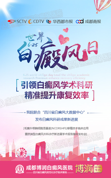 正值6.25世界白癜风日之际,我国作为白癜风的发病重点国家之一,有着近2000万发病人群。因此,每年此时都会呼吁大家关注白癜风患者,拒绝冷漠,消除歧视,传递爱心。我院也将联合四川省白癜风大数据中心,发布白癜风科研成果新进展,召开“毛囊外根鞘细胞混悬液(NCORSHFS)移植技术临床应用暨肢端型白癜风外科诊疗新进展学术报告媒体发布会”,推广白癜风精细化诊疗,精准提升白癜风康复效率!