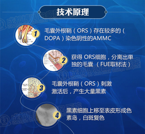 该操作通过提取毛囊外根鞘细胞(ORS),分离出単独的毛囊,供皮区创口肉眼几乎不可见,15-25个毛囊単位就能够提供300000-2000000个黑素细胞和角质形成细胞,足够用来治疗20cm2的白癜风皮损区。达到操作简単、创伤小、耗时少、并发症少等要求。