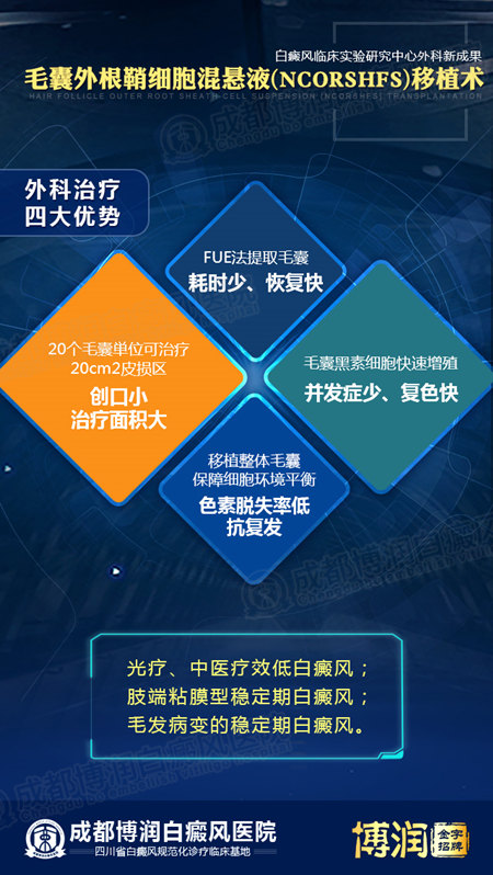 毛囊外根鞘细胞混悬液(NCORSHFS)移植术的应用,成功做到白癜风科研临床成果转化,提高临床诊疗效率,进一步完善白癜风规范化、精细化的诊疗。相信随着技术的推广,将大大提高西南乃至全国患者的康复率!