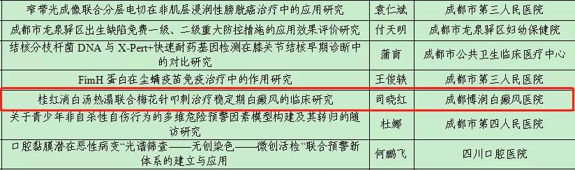 成都博润白癜风医院科研课题《桂红消白汤热溻联合梅花针叩刺治疗稳定期白癜风的临床研究》《白癜风患者的流行病学因素及行为特征调查与对策研究》成功获批,由成都市卫健委正式立项。